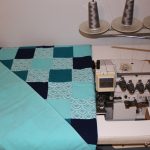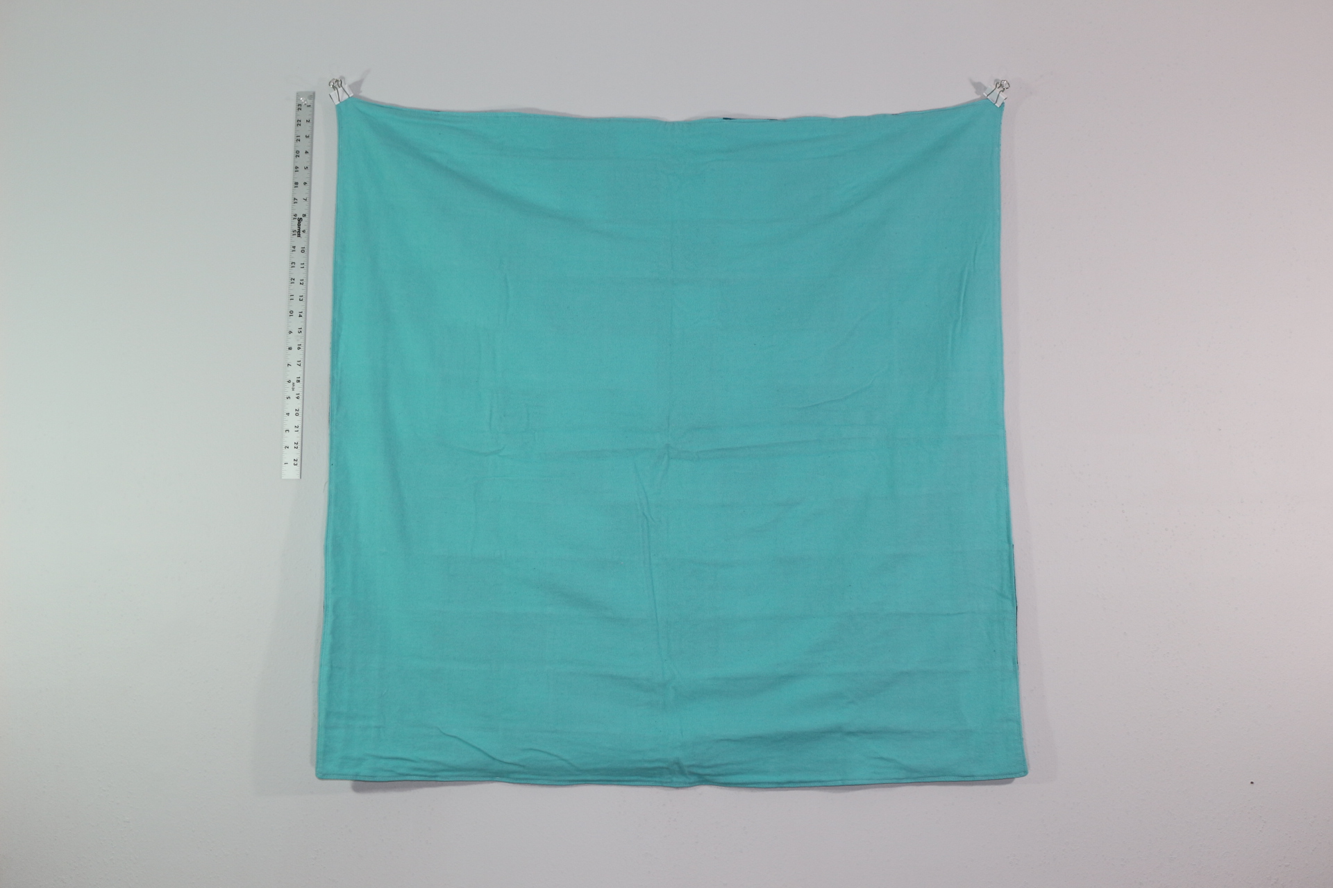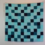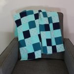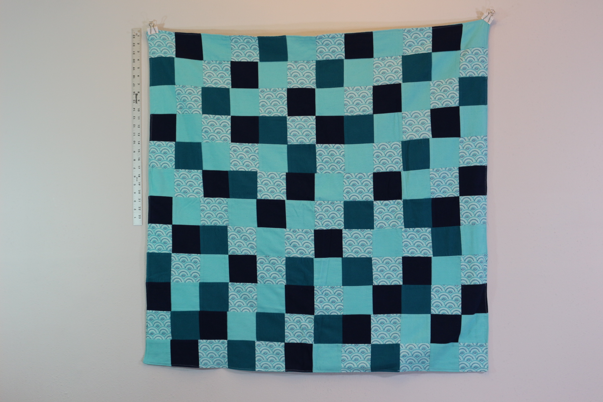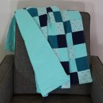 Random patchwork pattern of shades of teal and blue make up the front of this handmade, one of a kind blanket. The back is lined with a matching light teal soft flannel. Approx. 41″ x 41″