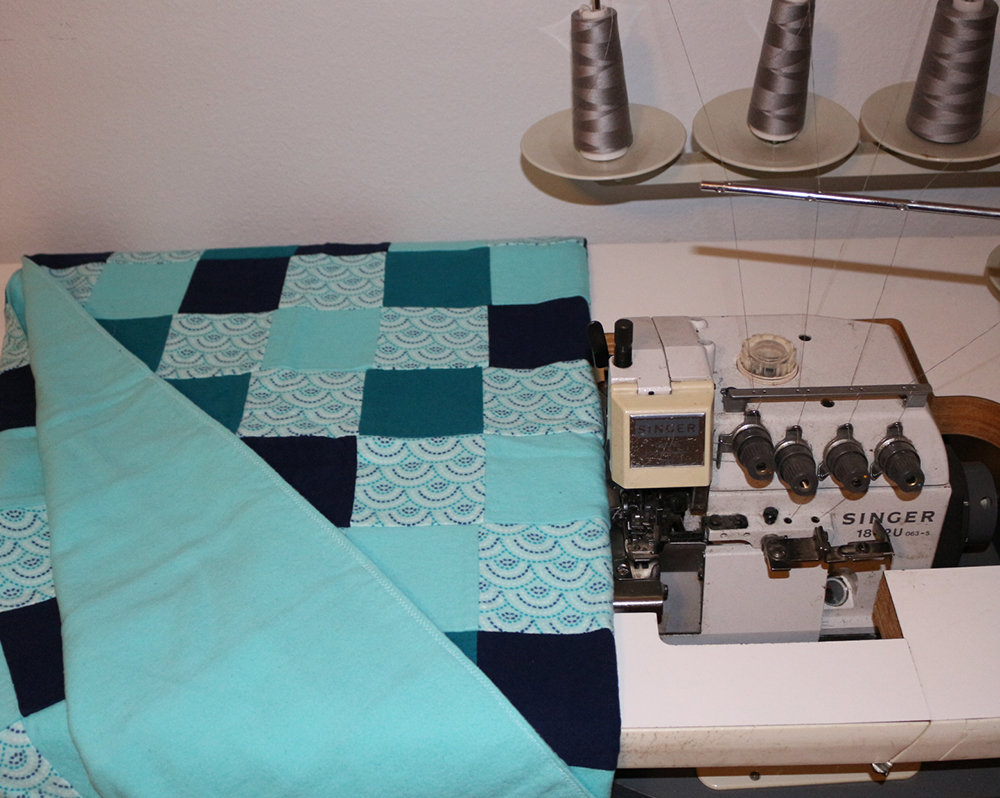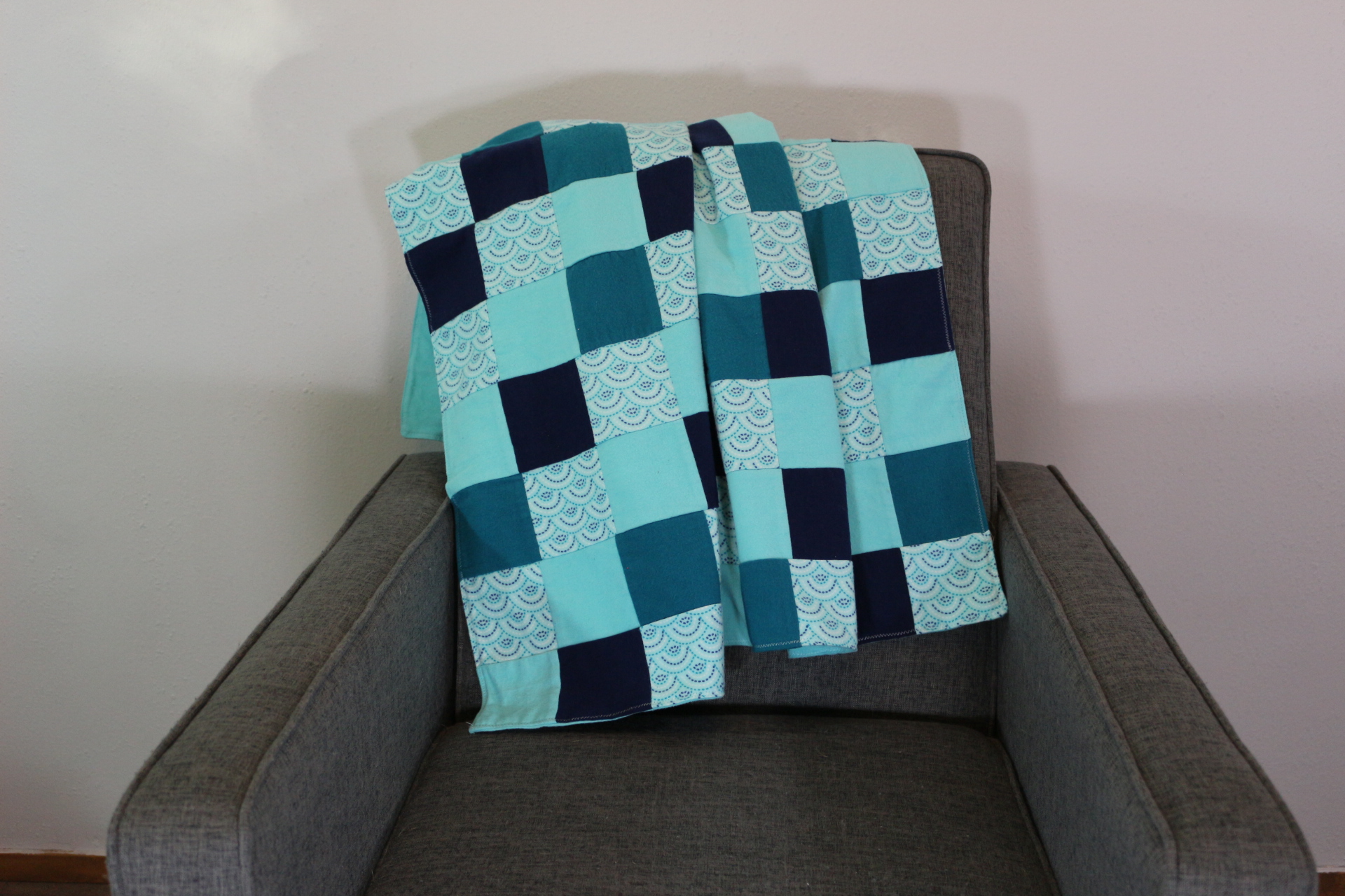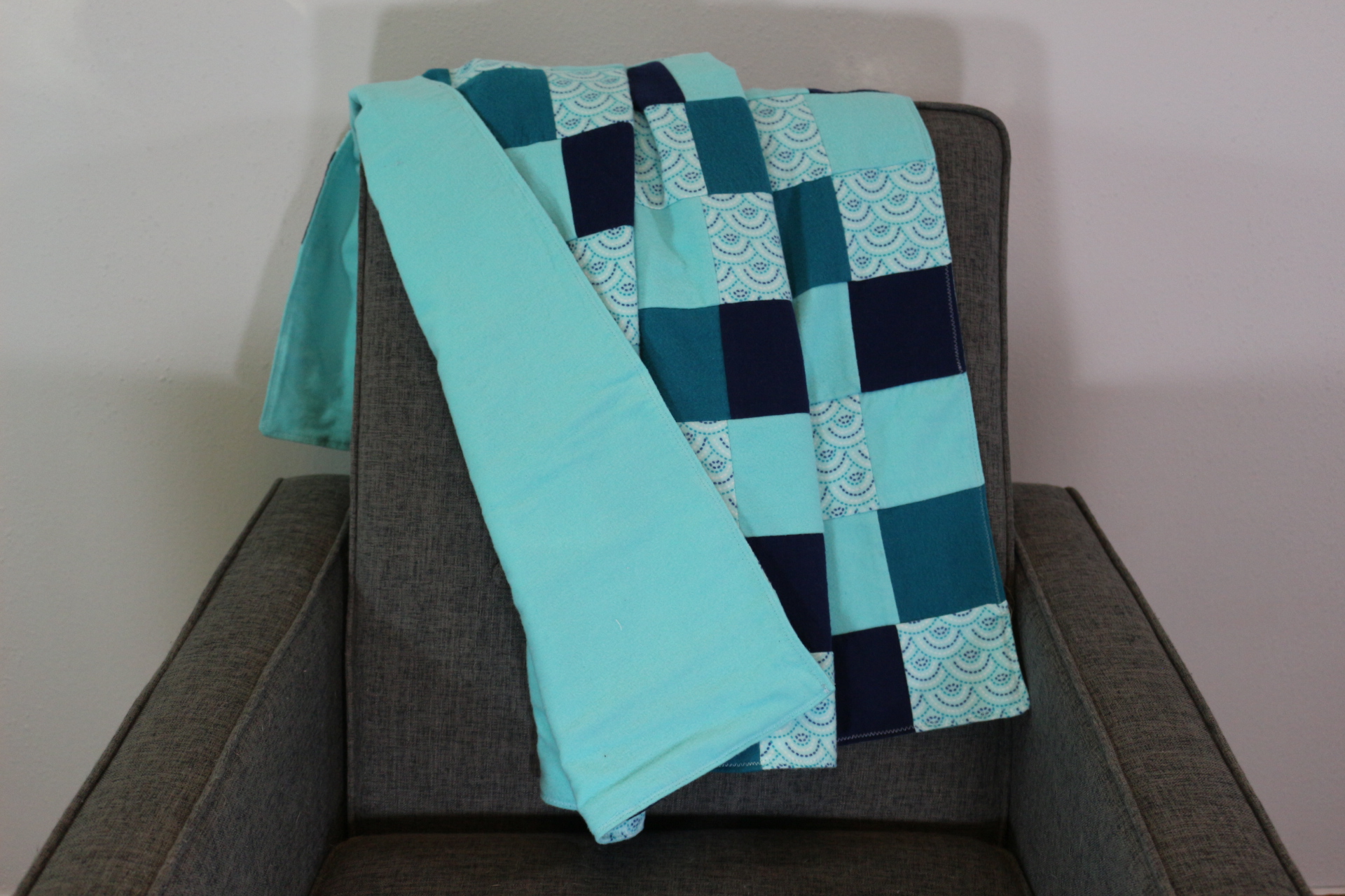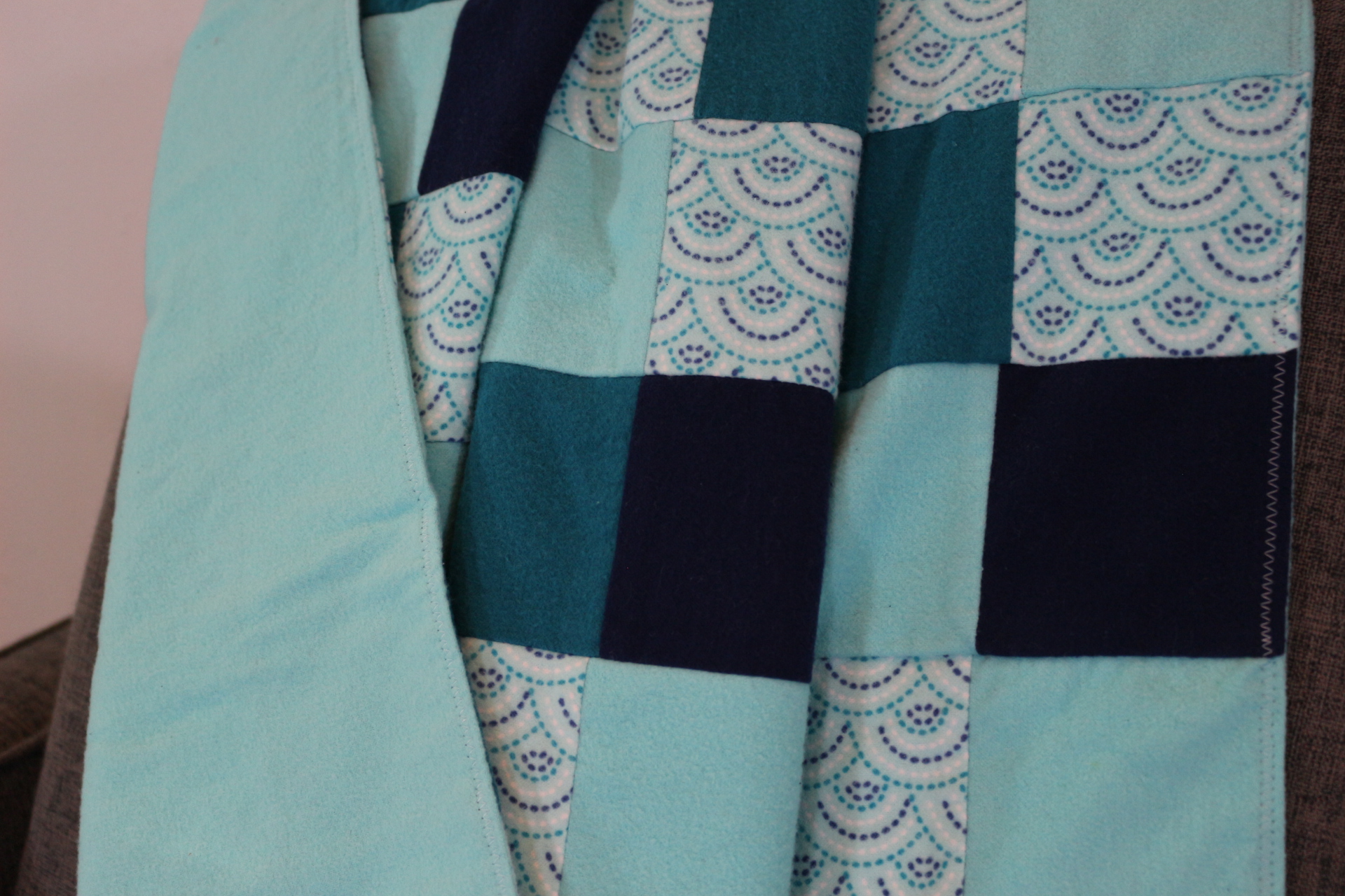 3 shades of blue and 1 print of soft flannel arranged in a random patchwork layout make up the front